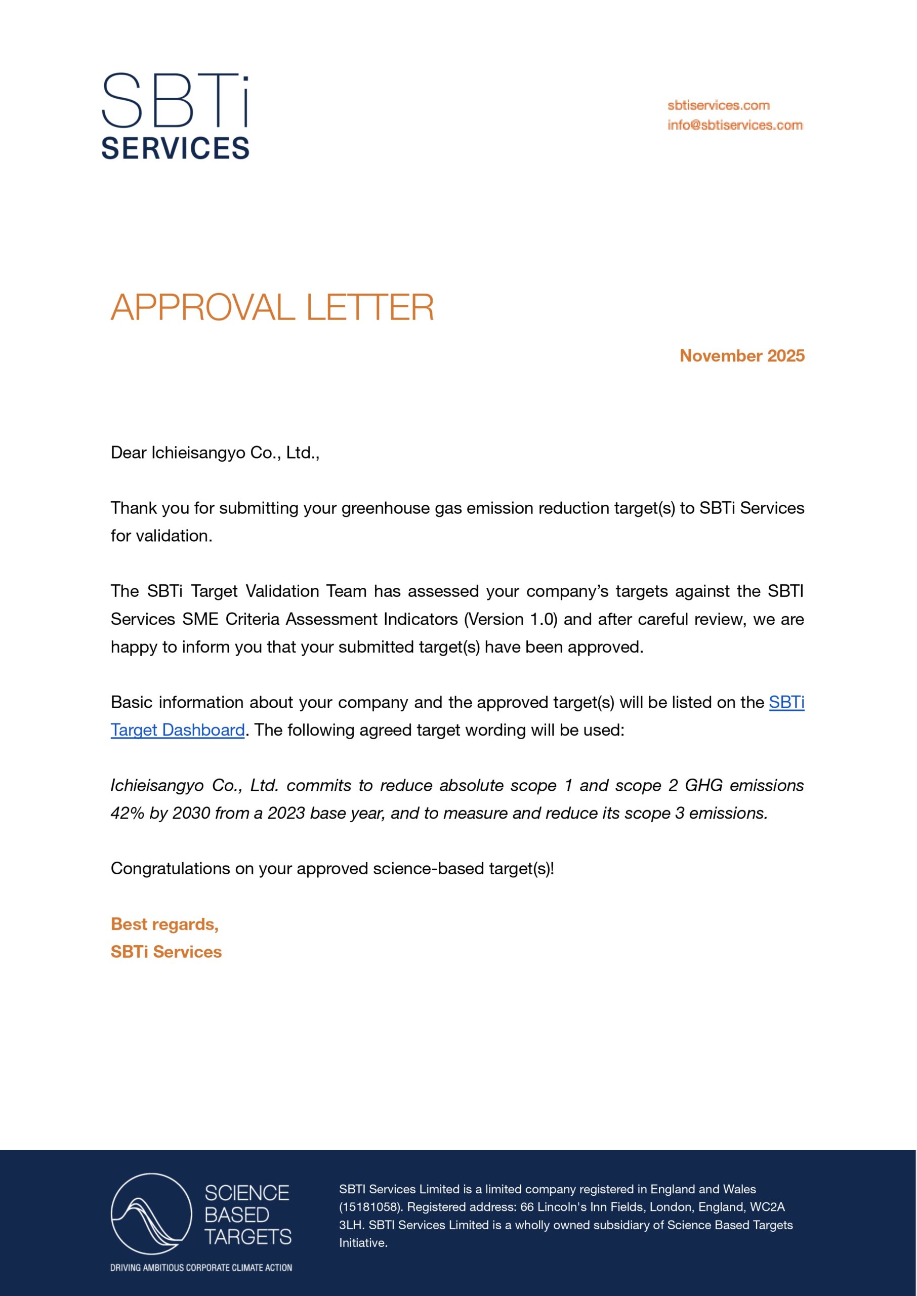【SBT認定書】Ichieisangyo Co._ Ltd. – SME Approval Letter_page-0001