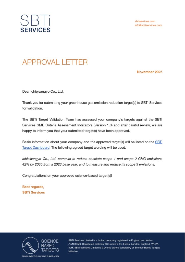 市栄産業株式会社は2025年11月、2030年に向けた当社の温室効果ガス排出削減目標が、地球温暖化対策への国際的な枠組みである「パリ協定」で掲げられた目標に整合する水準であるとして、SBT(Science Based Target)イニシアチブよりSBT認定を取得しました。